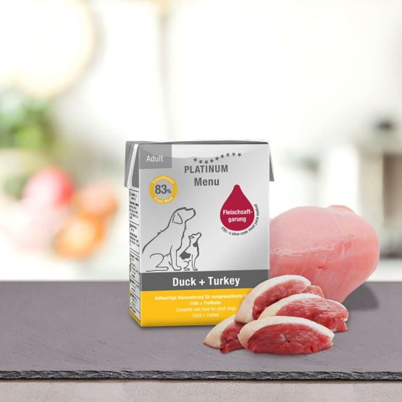Fleischsaftgarung è un processo in cui la carne fresca viene cotta nel suo succo ricco di sostanze nutritive, proprio come in cucina. Il nostro menu di cibo umido è creato utilizzando la tecnica di cottura breve. Questa tecnica di cottura funziona solo nel cartone Tetra Recart® perché consente di far raggiungere più rapidamente la temperatura corretta alla parte più all'interno della carne fresca per merito dei lati più stretti rispetto a una tradizionale lattina.