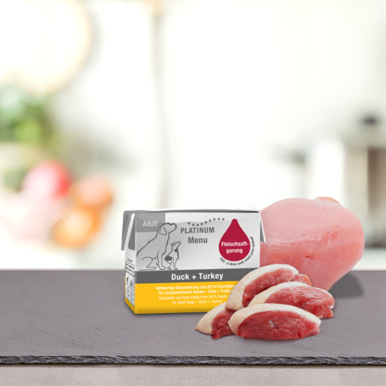 Fleischsaftgarung è un processo in cui la carne fresca viene cotta nel suo succo ricco di sostanze nutritive, proprio come in cucina. Il nostro menu di cibo umido è creato utilizzando la tecnica di cottura breve. Questa tecnica di cottura funziona solo nel cartone Tetra Recart® perché consente di far raggiungere più rapidamente la temperatura corretta alla parte più all'interno della carne fresca per merito dei lati più stretti rispetto a una tradizionale lattina.