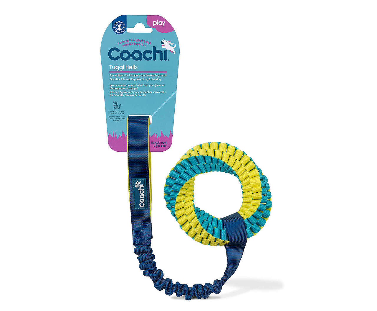 Il Coachi Tuggi Helix è un bungee tug toy con un design innovativo completamente nuovo. È leggero, incredibilmente resistente e dotato di un elastico super resistente e di un manico in neoprene morbido, per garantire che i giochi di tiro siano delicati sul collo e sulle zampe del tuo cane.