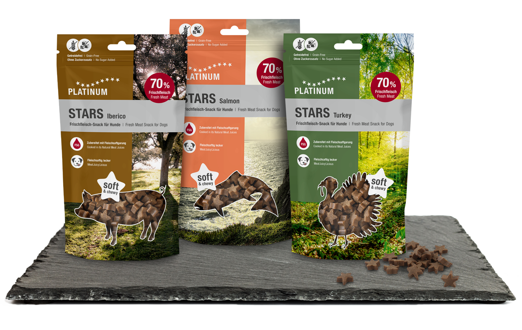 Le nostre STARS TRIO sono un assortimento di snack di carne fresca per cani.