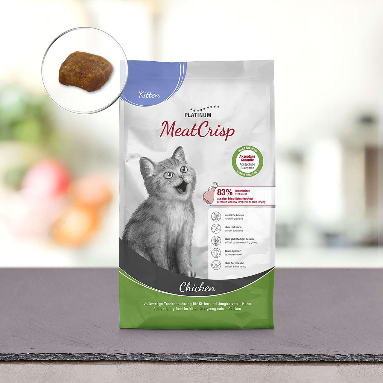 MeatCrisp Kitten Chicken è il primo cibo sano per gatti prodotto da un Freshmeatdryer. Contiene micronutrienti e amminoacidi naturali della carne fresca che rendono MeatCrisp il migliore sostituto della preda naturale di un gatto rispetto alla maggior parte dei cibi in commercio. Con MeatCrisp il tuo gatto si sentirà più in forma e rilassato e quindi più felice.